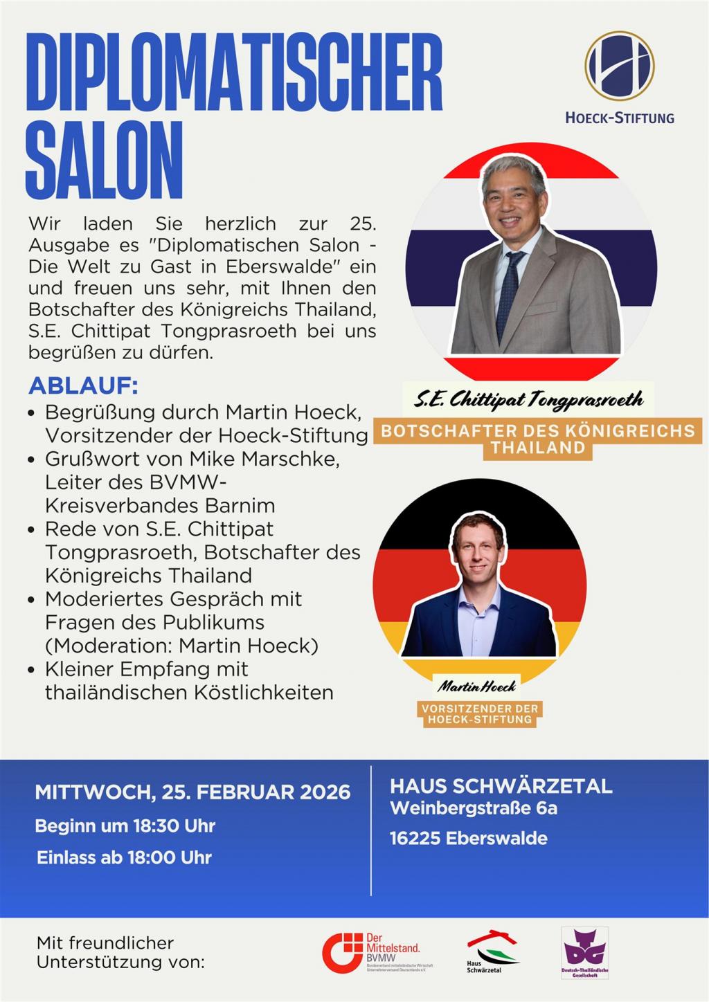 Berlin/Bangkok:Thailands neuer designierter Botschafter Dhiravat Bhumichitr empfing den Trade Advisor of Thailand in Germany RA Eberhard J. Trempel zu seinem Antrittsbesuch in der Botschaft des Königreichs Thailand in Berlin.Thailands ASEAN Strategie, der Stand der bilateralen Beziehungen zwischen Deutschland und Thailand sowie die Planung der nächsten 24 Monate bei der aktiven Wirtschaftsförderung und Wissenschaftskooperation waren einige Punkte des persönlichen Gesprächs.